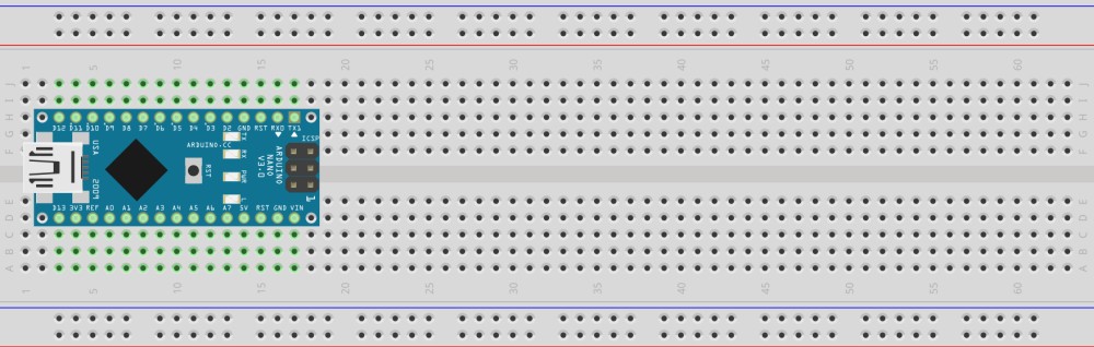 PRIMERO COLOCAMOS EL ARDUINO NANO EN LA PROTOBOARD